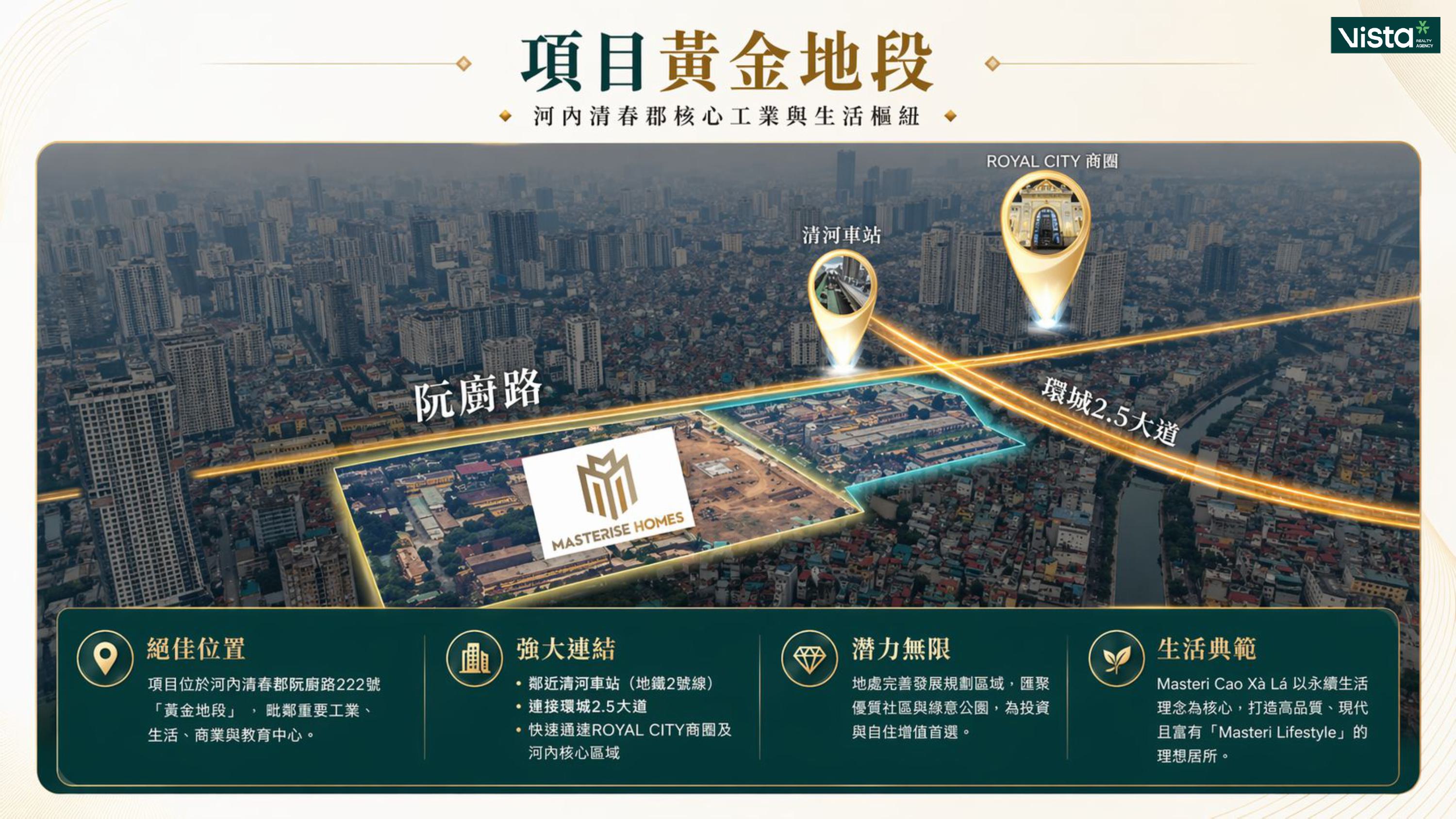 Masteri Cao Xà Lá-坐落河內核心南京阮廛黃金地段,結合TOD(大眾運輸導向開發)理念,無縫連接捷運與城市主幹交通網絡,打造集居住、